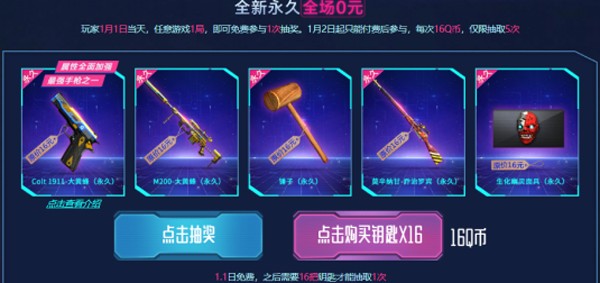 2、在1月1日当天参加一局游戏后可以获得一次活动抽奖机会,抽奖后会有概率获得柯尔特大黄蜂;