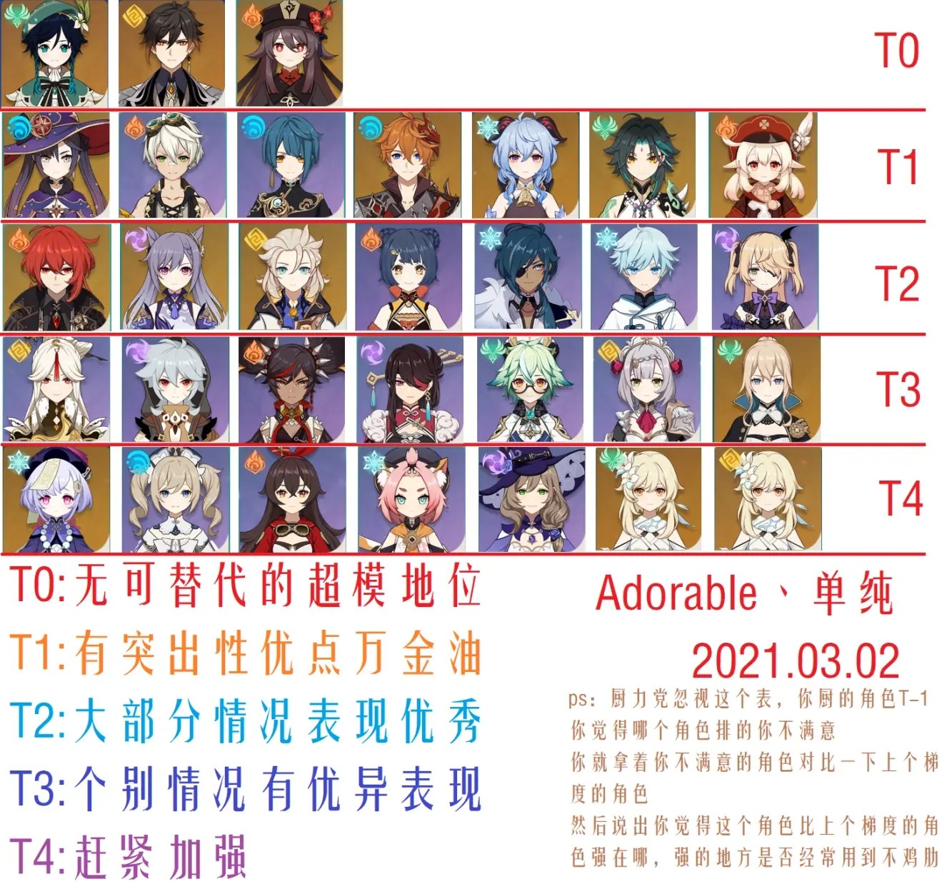 胡桃已经出完了,1.4版本不会有新五星角色而是老五星复刻,所以这个攻略是1.4版本的攻略基本也不算夸海口,上为五星角色篇,中为四星角色篇,下为5星武器以及部分好用的三四星武器篇。对于角色的优点缺点进行分析,对于武器的优点缺点进行分析,仅以强度进行分析,厨力加成暂不考虑在内,强度多参照深渊,因大世界以及副本难度实在有限,所以参照较少。