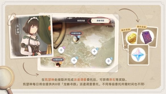 完成派遣后,可获得原石奖励,根据派遣人员的选择,亦可能收获摩拉、大英雄的经验、精锻用魔矿等额外奖励。
