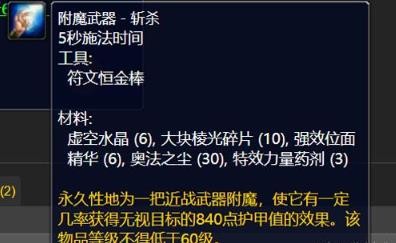 这3个附魔都是针对近战武器,魂霜可以提高冰霜暗影法伤,给冰法术士用,对标60级的法术伤害附魔;猫鼬与药剂的效果类似,让你攻击时可以触发120点敏捷和攻速加成;斩杀不仅外观特效好看,价值也是最高的,因为它可以让你的近战攻击破甲,破甲的概念在70级非常重要,可惜无法作用于远程武器。3种附魔图纸,前2种是卡拉赞的埃兰和管家掉,后1种要祖阿曼开了小怪刷出。