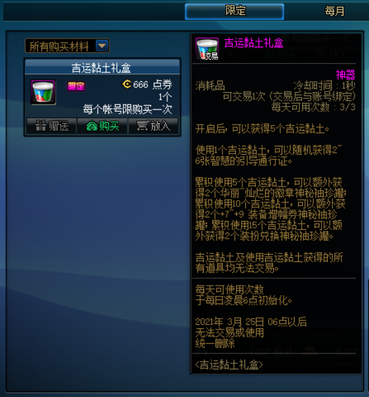 DNF吉运黏土礼盒获得方法在商城花费666点券购买,不能使用代币券,或者在拍卖行用金币购买,礼盒只能交易一次,打开后是获得5个吉运黏土的,礼盒打开一次后就消失了。
