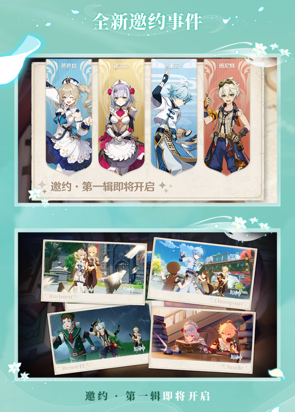 新增全新邀约系统,第一期开放芭芭拉、重云、班尼特、诺艾尔四位角色。邀约系统可理解为角色新增专属剧情,只不过每次选择会导致最终结局不同,完成任务后可任选其他选项查看不同结局。