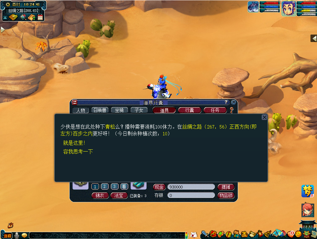 活动期间全天,玩家(等级≥50级,单人)使用“灵木司南”获取播种种子的最佳位置,并播种对应神秘种子,可以获得包括高级魔兽要诀在内的珍稀道具。环任务有一定概率获得神秘种子,同时也可前往长安城(227,118)春神句芒处购买。