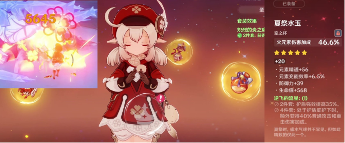 用可莉打冰树做示范,第一次不带帽子,用图中的火伤杯,伤害是5645