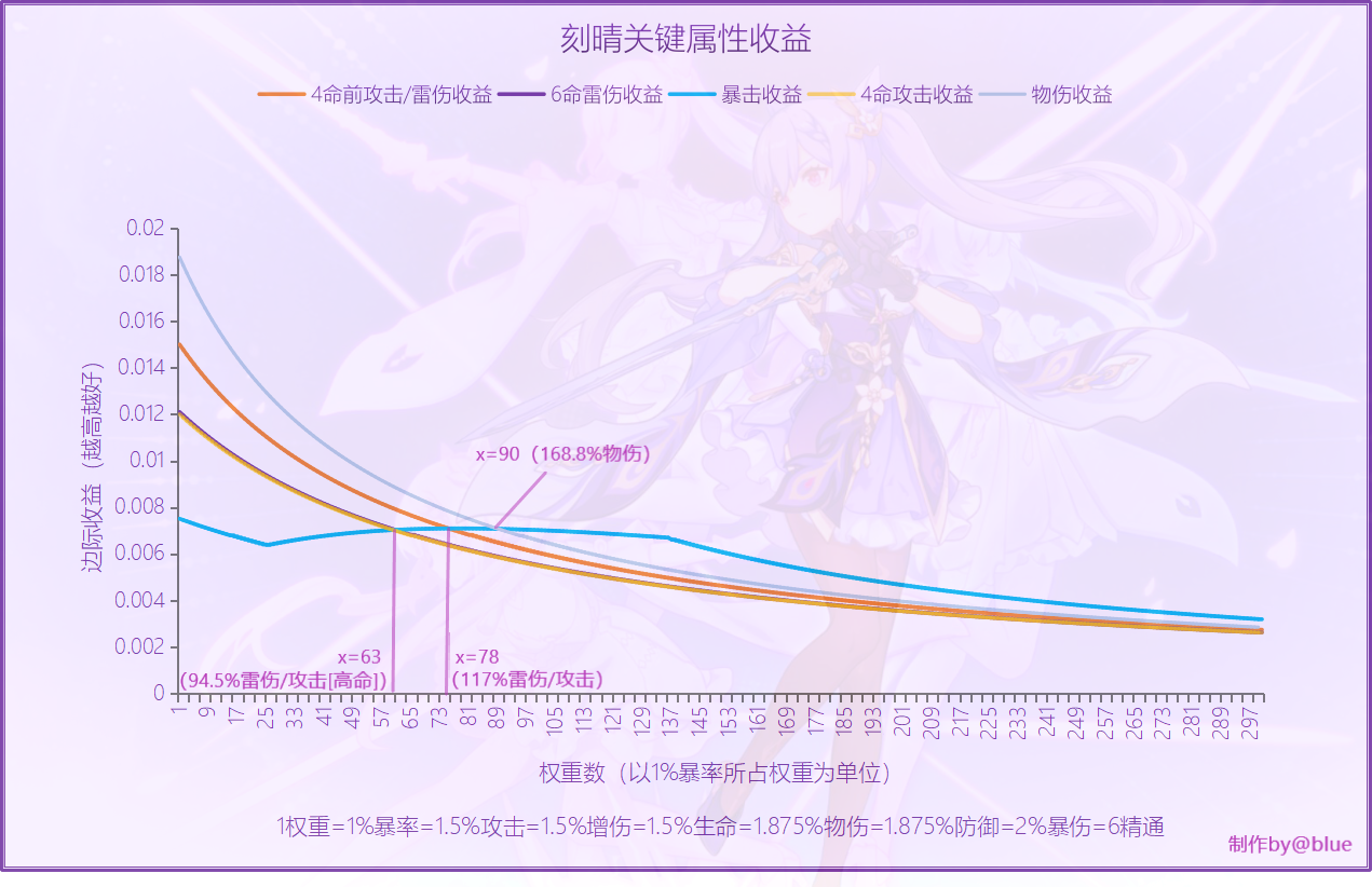 ——以你目前权重数最高的曲线为起点,作平行x轴的直线,看左方其它曲线的交点,这就代表你应该“回头”堆哪个属性。