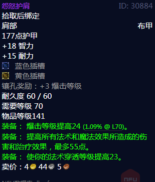 怨怒护肩属性,拾取后绑定,肩部布甲,177点护甲,+18智力,+15耐力,蓝色插槽,黄色插槽,镶孔奖励:+3爆击等级,耐久度60/60,需要等级70,物品等级141,装备:爆击等级提高24(1.09%@L70)。装备:提高所有法术和魔法效果所造成的伤害和治疗效果,最多55点。,装备:使你的法术穿透等级提高23。