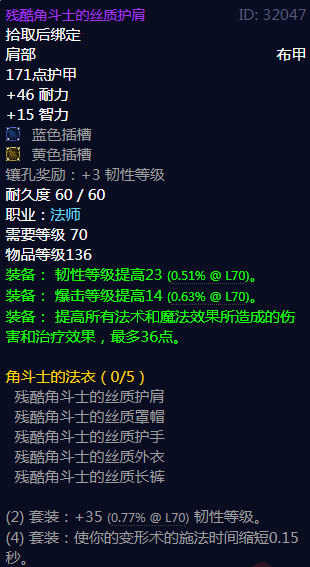 魔兽世界残酷角斗士的丝质护肩属性,拾取后绑定,肩部布甲,171点护甲,+46耐力,+15智力,蓝色插槽,黄色插槽,镶孔奖励:+3韧性等级,耐久度60/60,职业:法师,需要等级70,物品等级136,装备:韧性等级提高23(0.51%@L70)。装备:爆击等级提高14(0.63%@L70)。装备:提高所有法术和魔法效果所造成的伤害和治疗效果,最多36点。