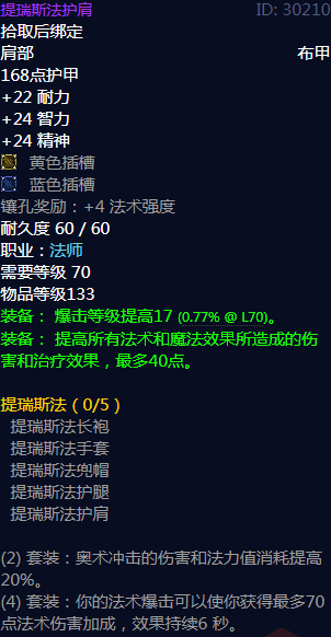 提瑞斯法护肩属性,拾取后绑定,肩部布甲,168点护甲,+22 耐力,+24 智力,+24 精神,黄色插槽,蓝色插槽,镶孔奖励:+4 法术强度,耐久度 60 / 60,职业:法师,需要等级 70,物品等级133,装备: 爆击等级提高17 (0.77% @ L70)。装备: 提高所有法术和魔法效果所造成的伤害和治疗效果,最多40点。