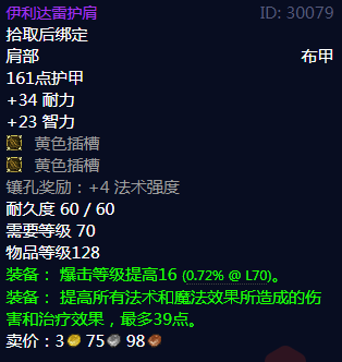 伊利达雷护肩属性,拾取后绑定,肩部 布甲,161点护甲,+34耐力,+23智力,黄色插槽,黄色插槽,镶孔奖励:+4法术强度,耐久度60/60,需要等级70,物品等级128,装备:爆击等级提高16(0.72%@L70)。装备:提高所有法术和魔法效果所造成的伤害和治疗效果,最多39点。