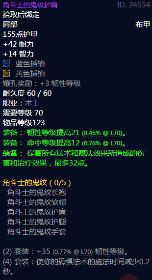 魔兽世界角斗士的鬼纹护肩属性,拾取后绑定,肩部布甲,155点护甲,+42耐力,+14智力,蓝色插槽,黄色插槽,镶孔奖励:+3韧性等级,耐久度60/60,职业:术士,需要等级70,物品等级123,装备:韧性等级提高21(0.46%@L70)。装备:命中等级提高12(0.76%@L70)。装备:提高所有法术和魔法效果所造成的伤害和治疗效果,最多32点。
