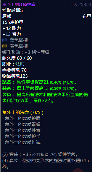 魔兽世界角斗士的丝质护肩属性,拾取后绑定,肩部布甲,155点护甲,+42耐力,+13智力,蓝色插槽,黄色插槽,镶孔奖励:+3韧性等级,耐久度60/60,职业:法师,需要等级70,物品等级123,装备:韧性等级提高21(0.46%@L70)。装备:爆击等级提高13(0.59%@L70)。装备:提高所有法术和魔法效果所造成的伤害和治疗效果,最多32点。