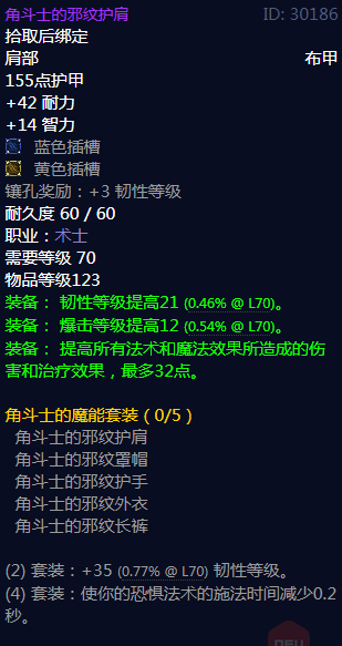 魔兽世界角斗士的邪纹护肩属性,拾取后绑定,肩部布甲,155点护甲,+42耐力,+14智力,蓝色插槽,黄色插槽,镶孔奖励:+3韧性等级,耐久度60/60,职业:术士,需要等级70,物品等级123,装备:韧性等级提高21(0.46%@L70)。装备:爆击等级提高12(0.54%@L70)。装备:提高所有法术和魔法效果所造成的伤害和治疗效果,最多32点。