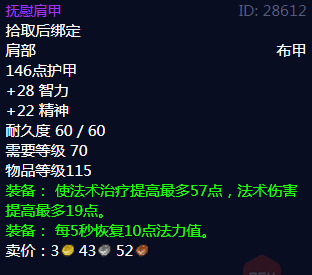 魔兽世界抚慰肩甲属性,拾取后绑定,肩部布甲,146点护甲,+28智力,+22精神,耐久度60/60,需要等级70,物品等级115,装备:使法术治疗提高最多57点,法术伤害提高最多19点。装备:每5秒恢复10点法力值。
