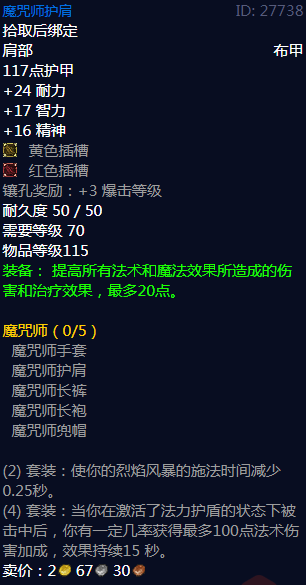 魔咒师护肩属性,拾取后绑定,肩部布甲,117点护甲,+24耐力,+17智力,+16精神,黄色插槽,红色插槽,镶孔奖励:+3爆击等级,耐久度50/50,需要等级70,物品等级115,装备:提高所有法术和魔法效果所造成的伤害和治疗效果,最多20点。