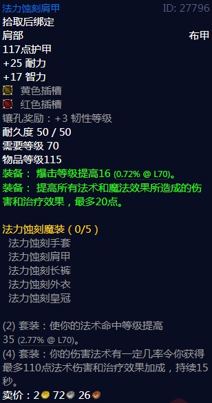 魔兽世界法力蚀刻肩甲属性,拾取后绑定,肩部布甲,117点护甲,+25耐力,+17智力,黄色插槽,红色插槽,镶孔奖励:+3韧性等级,耐久度50/50,需要等级70,物品等级115,装备:爆击等级提高16(0.72%@L70)。装备:提高所有法术和魔法效果所造成的伤害和治疗效果,最多20点。