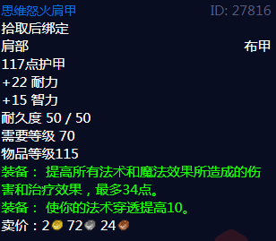 思维怒火肩甲属性,拾取后绑定,肩部布甲,117点护甲,+22耐力,+15智力,耐久度50/50,需要等级70,物品等级115,装备:提高所有法术和魔法效果所造成的伤害和治疗效果,最多34点。装备:使你的法术穿透提高10。