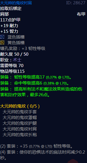 大元帅的鬼纹衬肩属性,拾取后绑定,肩部布甲,117点护甲,+19耐力,+15智力,蓝色插槽,黄色插槽,镶孔奖励:+3韧性等级,耐久度50/50,职业:术士,需要等级70,物品等级115,装备:韧性等级提高17(0.37%@L70)。装备:命中等级提高6(0.38%@L70)。装备:提高所有法术和魔法效果所造成的伤害和治疗效果,最多26点。