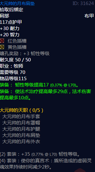 魔兽世界大元帅的月布肩垫属性,拾取后绑定,肩部布甲,117点护甲,+30耐力,+20智力,红色插槽,黄色插槽,镶孔奖励:+3韧性等级,耐久度50/50,职业:牧师,需要等级70,物品等级115,装备:韧性等级提高17(0.37%@L70)。装备:使法术治疗提高最多29点,法术伤害提高最多10点。