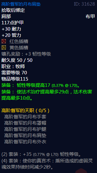 高阶督军的月布肩垫属性,拾取后绑定,肩部布甲,117点护甲,+30耐力,+20智力,红色插槽,黄色插槽,镶孔奖励:+3韧性等级,耐久度50/50,职业:牧师,需要等级70,物品等级115,装备:韧性等级提高17(0.37%@L70)。装备:使法术治疗提高最多29点,法术伤害提高最多10点。