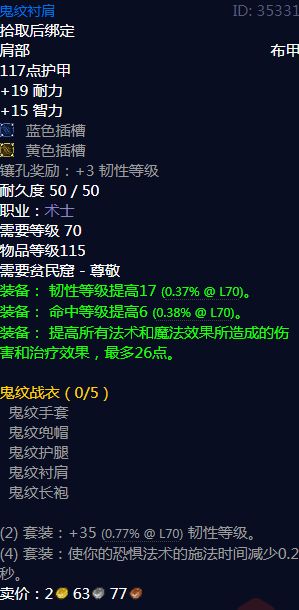 鬼纹衬肩属性,拾取后绑定,肩部布甲,117点护甲,+19耐力,+15智力,蓝色插槽,黄色插槽,镶孔奖励:+3韧性等级,耐久度50/50,职业:术士,需要等级70,物品等级115,需要贫民窟-尊敬,装备:韧性等级提高17(0.37%@L70)。装备:命中等级提高6(0.38%@L70)。装备:提高所有法术和魔法效果所造成的伤害和治疗效果,最多26点。