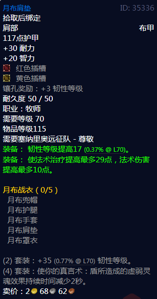魔兽世界月布肩垫属性,拾取后绑定,肩部布甲,117点护甲,+30耐力,+20智力,红色插槽,黄色插槽,镶孔奖励:+3韧性等级,耐久度50/50,职业:牧师,需要等级70,物品等级115,需要塞纳里奥远征队-尊敬,装备:韧性等级提高17(0.37%@L70)。装备:使法术治疗提高最多29点,法术伤害提高最多10点。