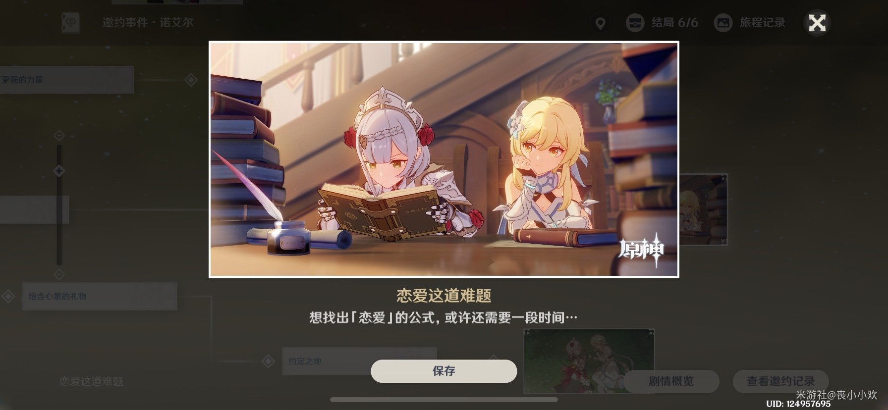 告诉诺艾尔她需要休息,结果还是要去给一个阿姨打工,阿姨要给她喜欢的男人送礼物,向我们拿意见(什么嘛,我才不在意呢)给阿姨倒一杯卡布奇诺,说错了,是一份蒙德烤鱼,打发完毕后,诺艾尔去图书馆补修恋爱学。