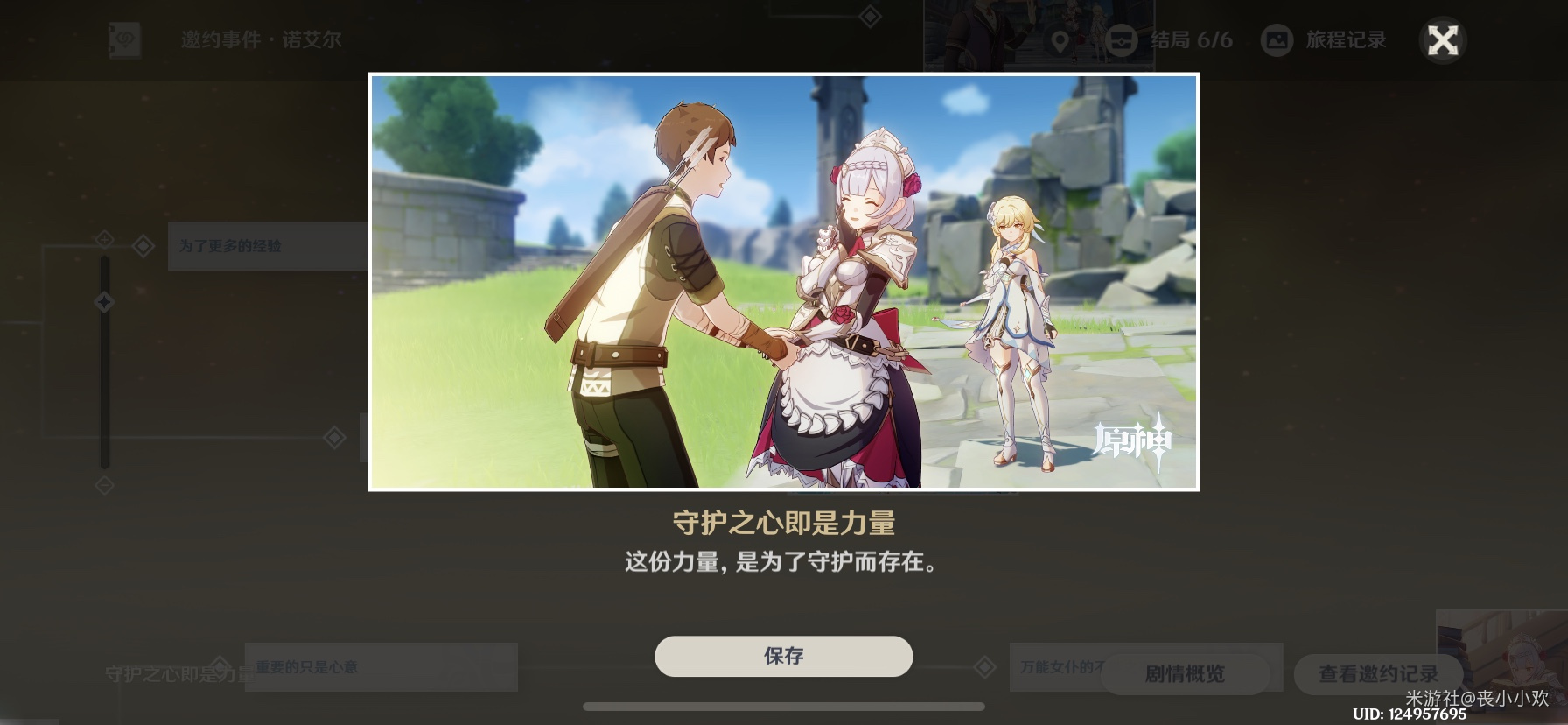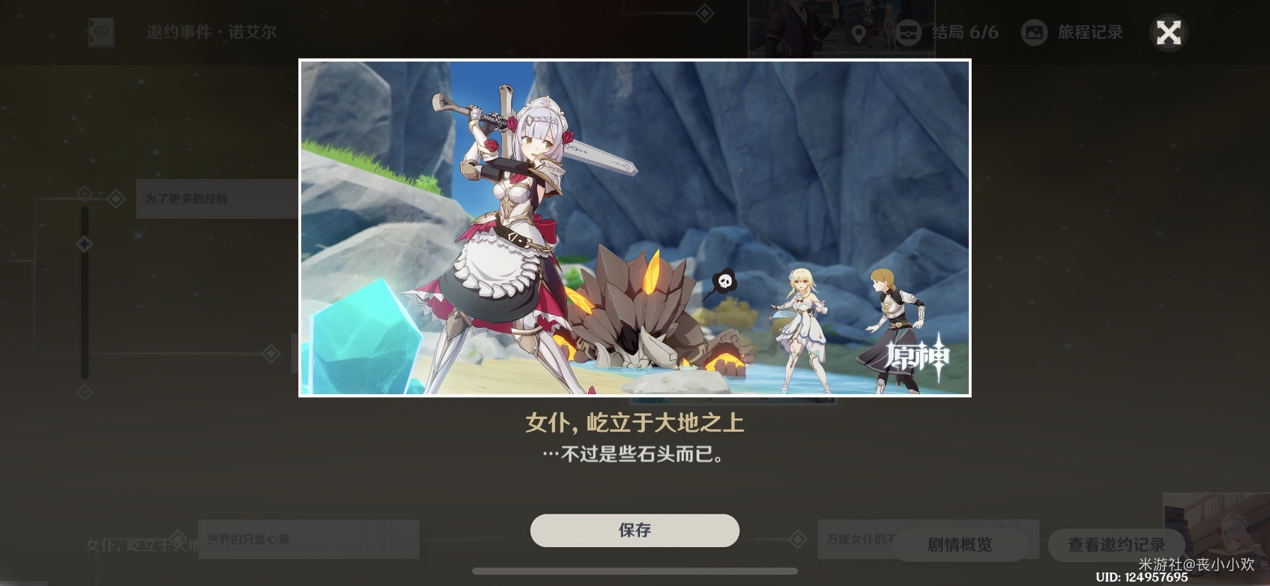 告诉艾尔她欠缺力量,并在诺艾尔展示力量(走到木桩中间重击,向前闪避平砍一刀)切掉所有的木桩后,告诉她还欠缺技巧,与史莱姆和丘丘人作战后救下情敌。