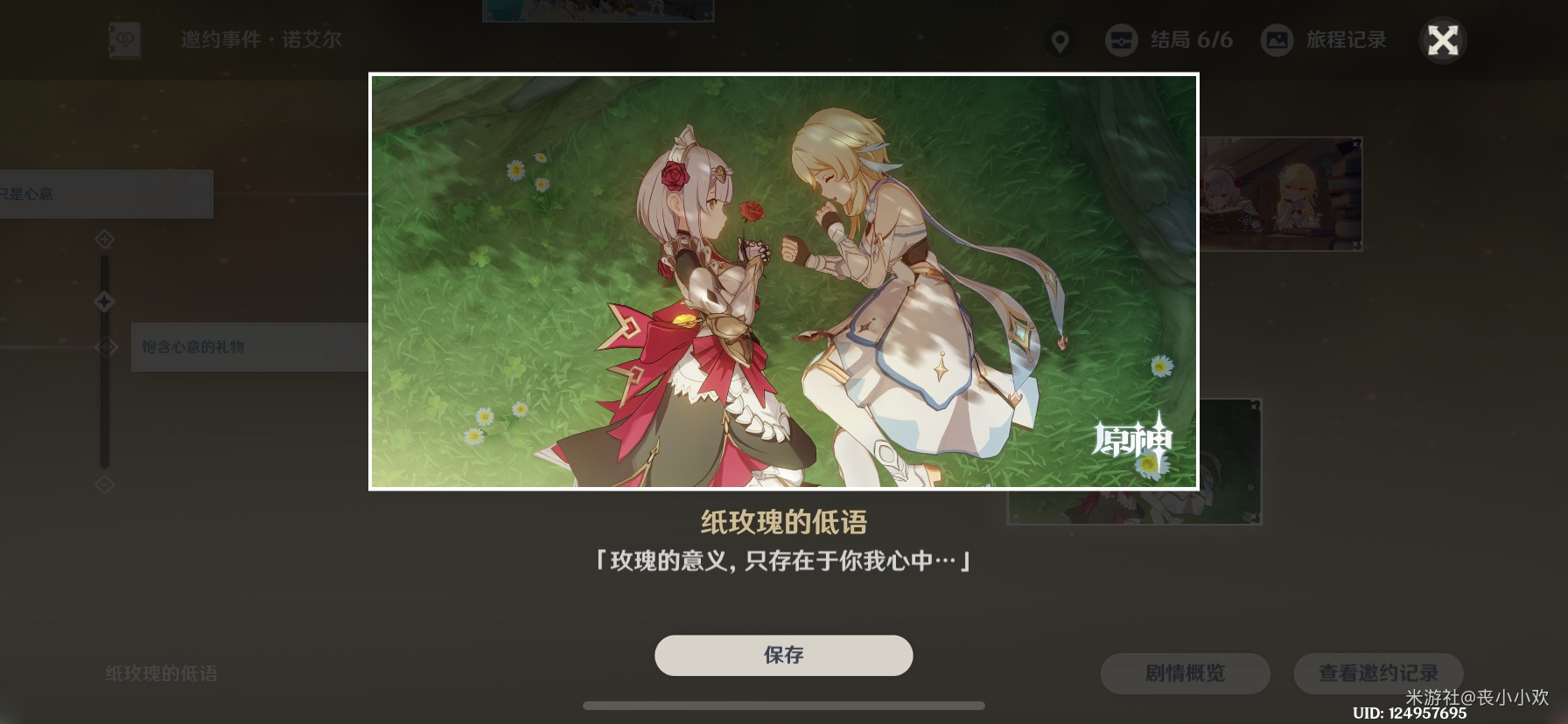 与五同样开局,只不过认真帮助了阿姨,去各个景点拍照打卡,并得知诺艾尔喜欢风起地。在树下收获的诺艾尔送我的玫瑰!她送我玫瑰!她心里有我,她也爱我!快进到民政局领证!