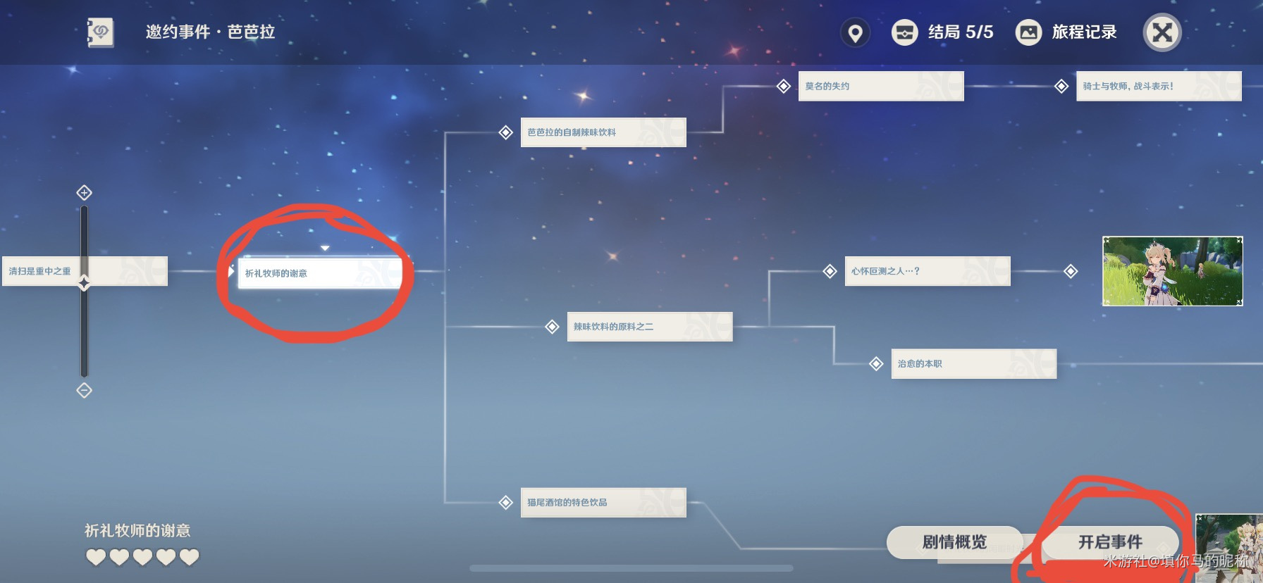 在子任务“祈礼牧师的谢意”选择猫尾酒馆的特色饮料(叫什么qq内内好喝到没噗茶)做完支线达成结局5