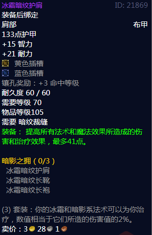 魔兽世界冰霜暗纹护肩属性,装备后绑定,肩部布甲,133点护甲,+15智力,+21耐力,黄色插槽,蓝色插槽,镶孔奖励:+3命中等级,耐久度60/60,需要等级70,物品等级105,需要暗纹裁缝,装备:提高所有法术和魔法效果所造成的伤害和治疗效果,最多41点。
