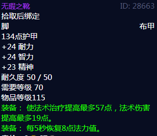 无瑕之靴属性,拾取后绑定,脚布甲,134点护甲,+24耐力,+24智力,+23精神,耐久度50/50,需要等级70,物品等级115,装备:使法术治疗提高最多57点,法术伤害提高最多19点。装备:每5秒恢复8点法力值。