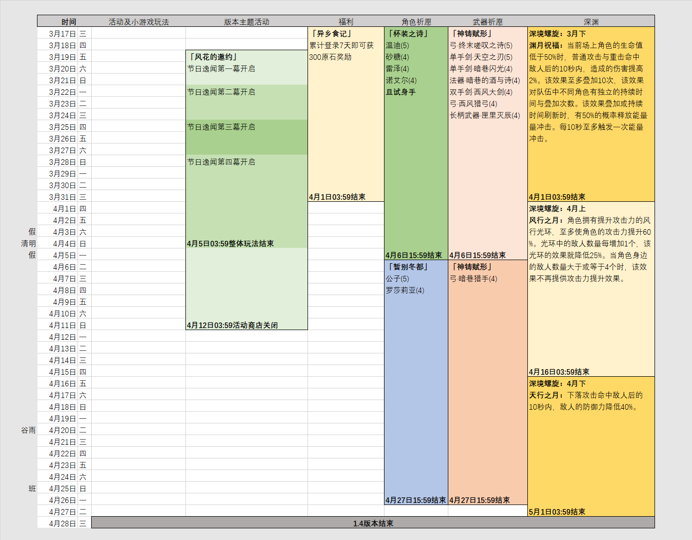 游戏《原神》中,节日逸闻分为四幕,每一幕有三个子任务,共十二个委托。那么1.4版本活动有哪些呢?很多玩家并不了解,各位小伙伴,一起来看1.4版本活动时间表吧。