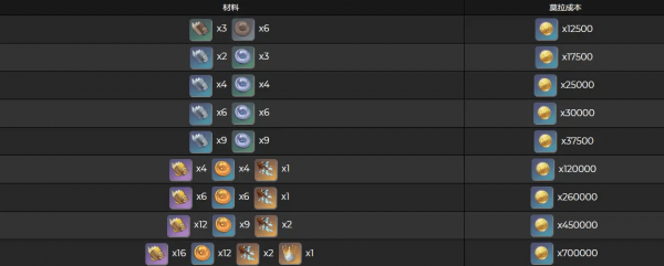 寻宝鸦印、藏银鸦印和攫金鸦印和黄金系列材料,以及一种不知名的材料。