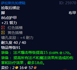 魔兽世界萨拉斯先知便鞋属性,拾取后绑定,脚布甲,86点护甲,+21智力,红色插槽,黄色插槽,镶孔奖励:+4耐力,耐久度40/40,物品等级91,装备:法术爆击等级提高15(0.68%@L70)。装备:提高所有法术和魔法效果所造成的伤害和治疗效果,最多18点。