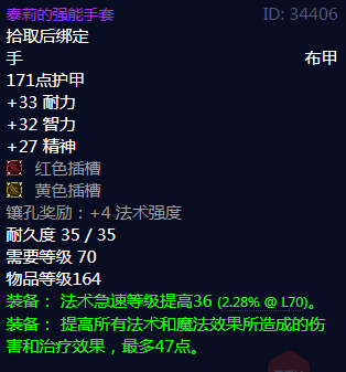 泰莉的强能手套属性,拾取后绑定,手布甲,171点护甲,+33耐力,+32智力,+27精神,红色插槽,黄色插槽,镶孔奖励:+4法术强度,耐久度35/35,需要等级70,物品等级164,装备:法术急速等级提高36(2.28%@L70)。装备:提高所有法术和魔法效果所造成的伤害和治疗效果,最多47点。