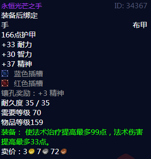 永恒光芒之手属性,装备后绑定,手布甲,166点护甲,+33耐力,+30智力,+37精神,蓝色插槽,红色插槽,镶孔奖励:+3精神,耐久度35/35,需要等级70,物品等级159,装备:使法术治疗提高最多99点,法术伤害提高最多33点。