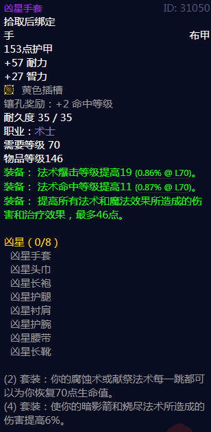 魔兽世界凶星手套属性,拾取后绑定,手布甲,153点护甲,+57耐力,+27智力,黄色插槽,镶孔奖励:+2命中等级,耐久度35/35,职业:术士,需要等级70,物品等级146,装备:法术爆击等级提高19(0.86%@L70)。装备:法术命中等级提高11(0.87%@L70)。装备:提高所有法术和魔法效果所造成的伤害和治疗效果,最多46点。