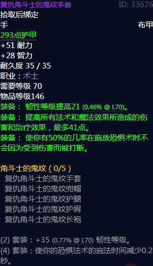 复仇角斗士的鬼纹手套属性,拾取后绑定,手布甲,293点护甲,+51耐力,+28智力,耐久度35/35,职业:术士,需要等级70,物品等级146,装备:韧性等级提高21(0.46%@L70)。装备:提高所有法术和魔法效果所造成的伤害和治疗效果,最多41点。装备:使你有50%的几率在施放恐惧术时不会因为受到伤害而被打断。