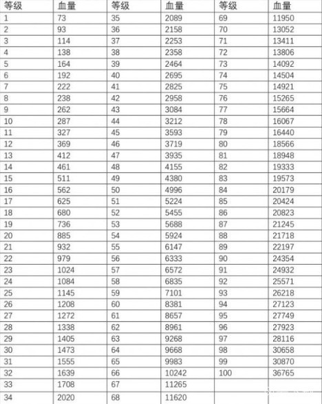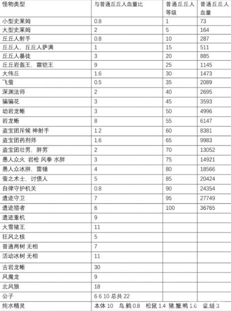 关于丘丘人具体的血量和等级关系,可以参考这张表格: