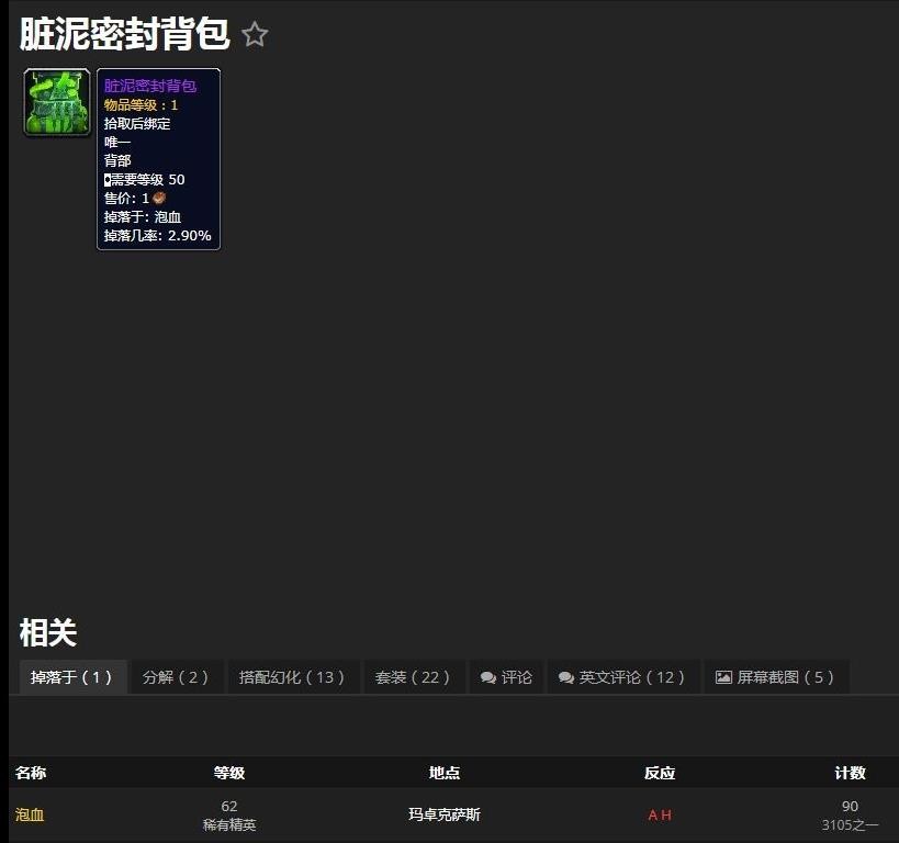 魔兽世界脏泥密封背包掉率是多少?