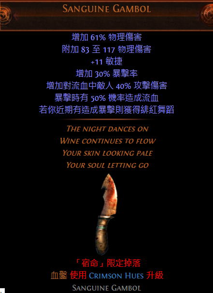 1.高ROLL可以达到250DPS的匕首,1.3攻速略慢,7.8爆率一般