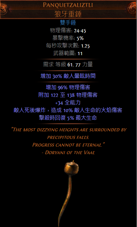1.400DPS双手锤,1.25攻速,5%爆率。DPS在传奇双手锤中不算低(康哥也就这个水平)