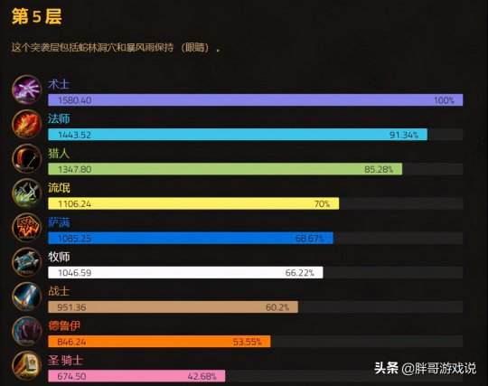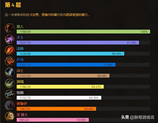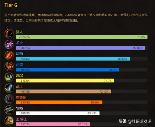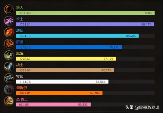 遗憾的是这份数据中并未包含太阳井的数据,最后只有一个总排名,这其中猎人和术士几乎没有差距,而法师同样处于第三名的位置,接下来是萨满,盗贼以及战士,最后才是牧师,小德以及圣骑士。
