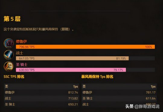 T5阶段,也就是TBC版本的P2阶段,这个阶段有两个T5级别的副本,在这个阶段,熊德依然排在第一位,防战则成功超过了防骑,成为了排名第二坦克职业。而之所以出现这种情况,胖哥个人认为应该是防战T5套装带来的优势,毕竟防战的T5套装效果在仇恨能力上是远远好于防骑T5套装效果的。