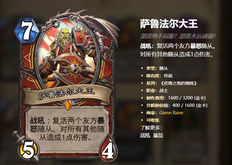 而在全新的扩展包中,战士职业也再次迎来了一位魔兽背景下的铁血勇士——传说随从萨鲁法尔大王重磅降临,7费5/4的身材、复活两只暴怒(新机制:受到伤害并存活时发动卡牌效果)随从并全场打1,这位参与过几乎所有部落战役的崇高战士将永远奋战到底,在炉石旅店的牌桌上掀起新一轮的血雨腥风。