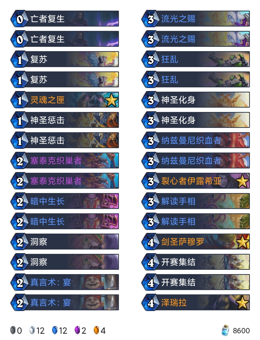 炉石传说中,贫瘠之地集结牧卡组搭配是:亡者复生*2、复苏*2、流光之赐*2、狂乱*2、神圣化身*2、神圣惩击*2、暗中生长*2、洞察*2、开赛集结*2、解读手相*2等卡组搭配。