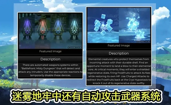 迷雾地牢中存在自动攻击武器系统,将会检测并攻击任何闯入者,玩家可以通过适当的反应来暂时无效化这些设备。另外,无相之冰也要在1.5版本和大家见面了,它的地点是在龙脊雪山中。