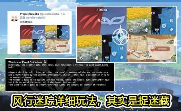 Windtrace,翻译过来就是风行迷踪,蒙德城历史上的经典游戏,终于再一次举办了,实这个活动就是躲猫猫,奖励也很丰富,包括原石、经验书、摩拉、天赋素材等等。