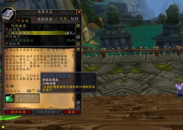 破烂的巫术布袋可以说是整个TBC版本中最容易获得的容量背包,不仅容量高达20格,还基本算是“点击就送”。玩家只需要在沙塔斯城接到《闪亮闪亮的东西!》这个任务,然后前往祖阿曼门口交任务,后续接到一个《诱人的保证》任务,做完之后就可以获取了。不过遗憾的是,由于祖阿曼需要等到TBC版本怀旧服第四阶段才会开放,所以在初期是无法获得的。
