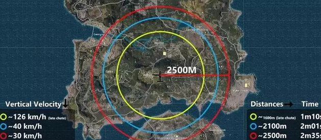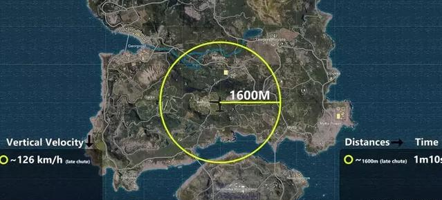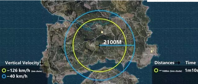 只要控制下降的速度在30左右,我们可以到达地图的半径为2500米(两格半)并且需要下降就开伞,落地时间为155s。